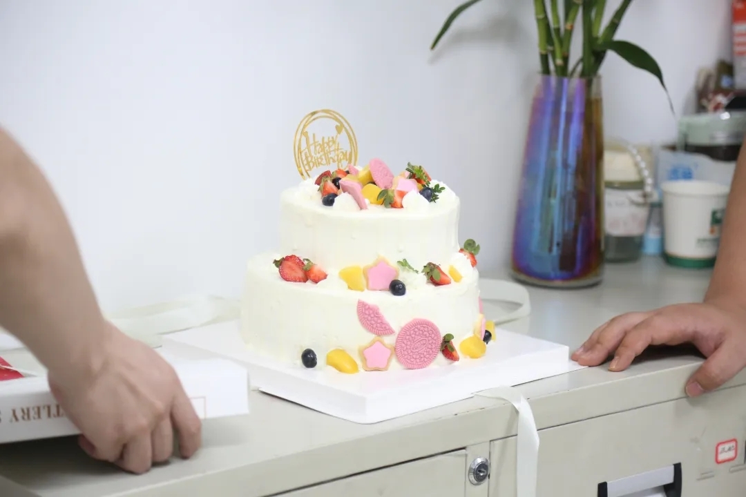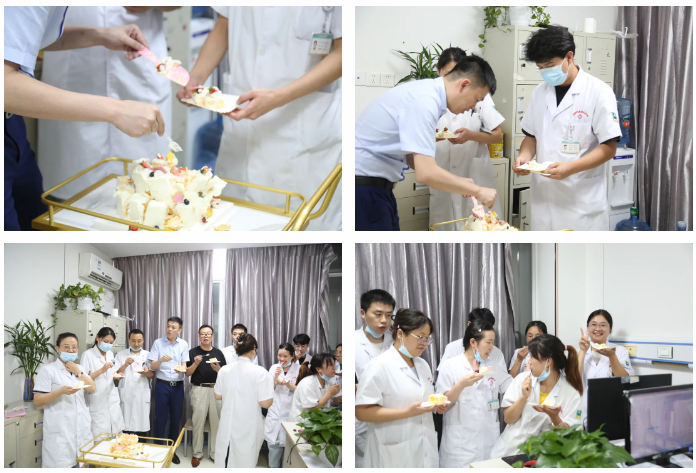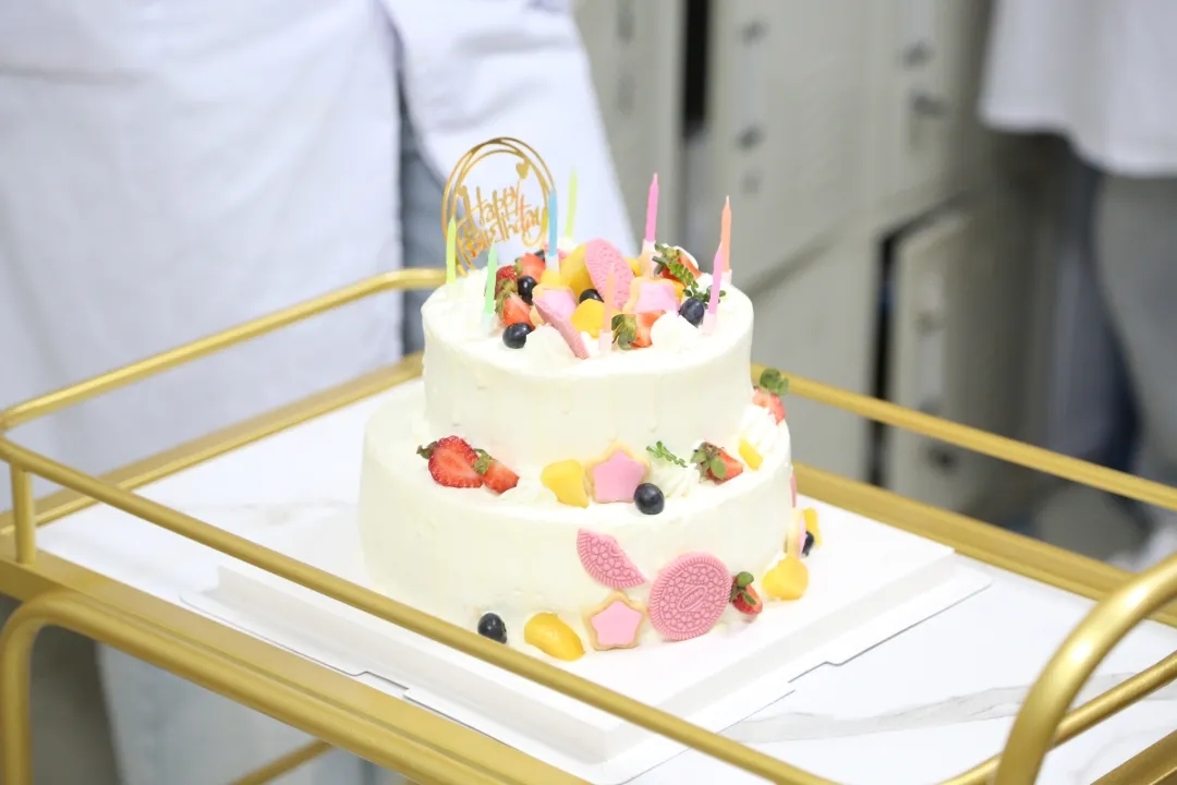 8月9日,随着午后温柔的阳光悄悄洒进办公室,一份特别的惊喜正悄悄酝酿。办公室的门被轻轻推开,摆放着双层生日蛋糕的小推车进入康复科同事们眼帘,瞬间点燃了整个空间的喜悦氛围。
