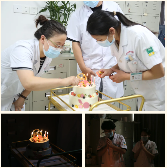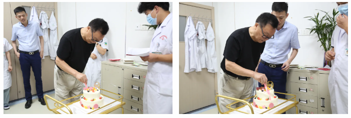 在大家的掌声与欢呼声中,康复科赵主任和两位寿星一起点燃了每一根蜡烛。烛光摇曳,映照在他们满是笑容的脸上,那一刻,时间仿佛凝固,只留下温暖与幸福。