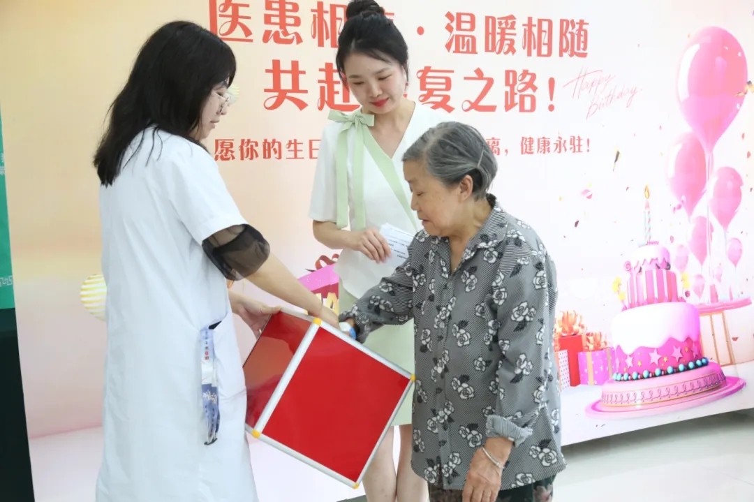 随后,胥院长亲自为每位寿星送上了一箱牛奶和一束鲜花。寿星们接过礼物,脸上露出了感激的笑容。