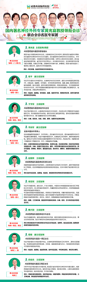 成都西南脑科医院建院至今,始终坚持“医师型、技术型、学术型”办院路线。本次入驻114挂号平台,将结合现有医疗优势,多学科联合会诊,为患者提供更科学的诊疗方案。同时,由国内神经外科医生黄光富教授领衔会诊,为西南地区患者搭建脑科疾病医生诊疗平台。