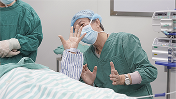 手术台上,这位帕金森患者正在进行机器人定位脑手术,解决其一侧肢体抖动的问题。刚开始患者有点害怕,在赵全军教授及其他手术医生的安慰和指导下,配合医生做动作,慢慢的在手术台上就不抖了。