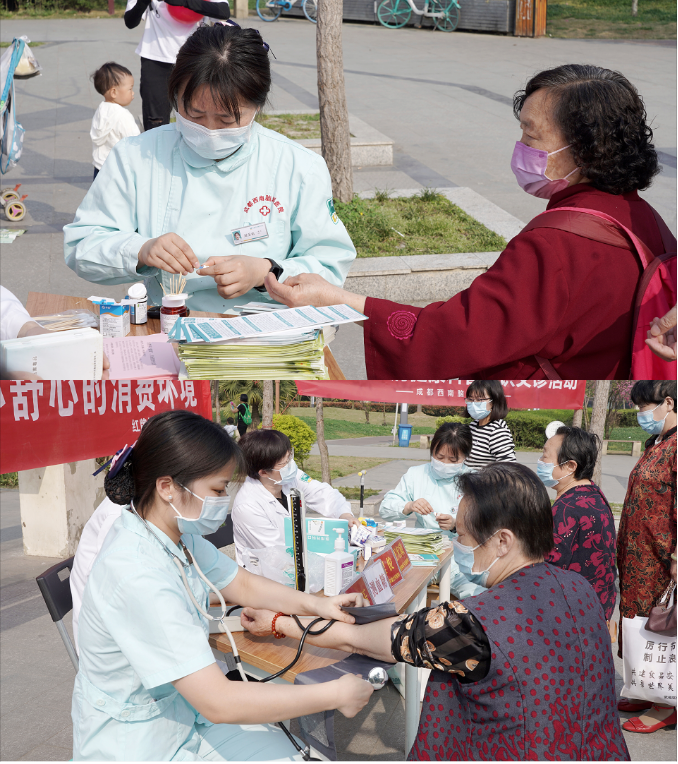 在活动现场,我院医护人员在神经内科程俊主任和王宏敏主任的带队下,为社区群众量血压、检测血糖,还特别就春夏交替时节易发病进行了详细检查,针对不同脑病患者的具体情况提出了专业的日常护理技巧,赢得一致好评。