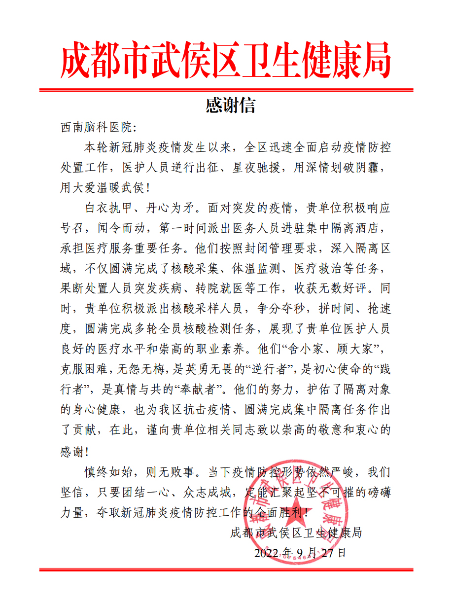 信中充分肯定了我院对武侯区疫情防控工作的大力支持,并对我院支援人员的辛勤付出表示了衷心的感谢。