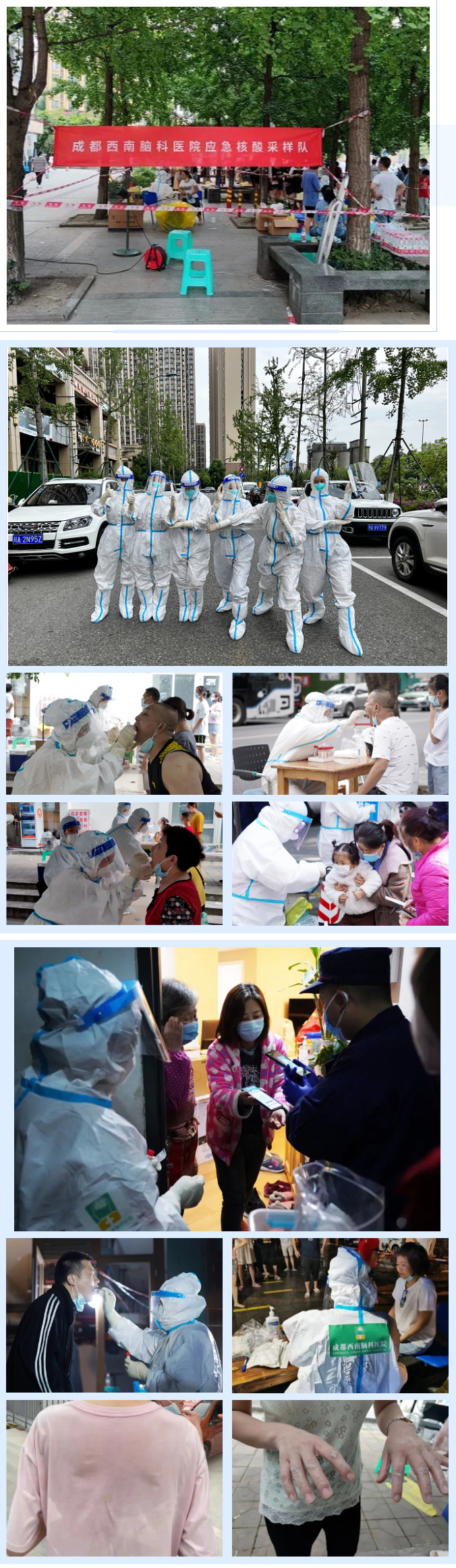 面对反反复复的疫情,我院积极响应区卫生健康局号召,迅速反应,主动参与。在9月2~19日期间,我院分批次共计百余人次全身心投入到全区各核酸采样点工作中,为武侯区第一时间阻断疫情传播贡献了一份力量。