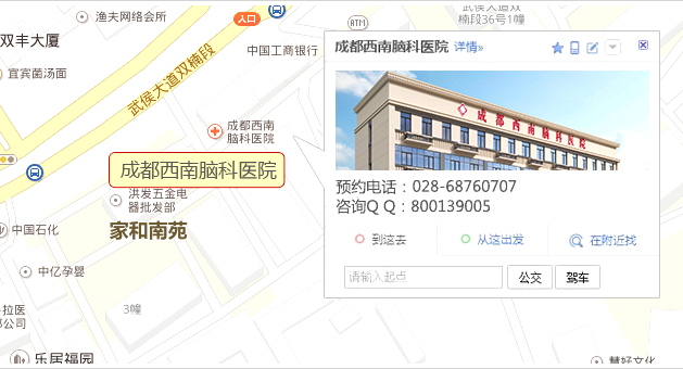 市内可搭乘公交车45路/53路/72路/201路/334路/368a路/368路/1028路至双丰路站下车,步行至武侯大道双楠段38号-成都西南脑科医院。