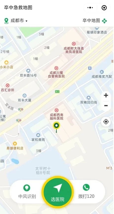 1、小程序搜索“卒中地图”,进入页面后点击“选医院”,就会出现定位周边的卒中救治医院。