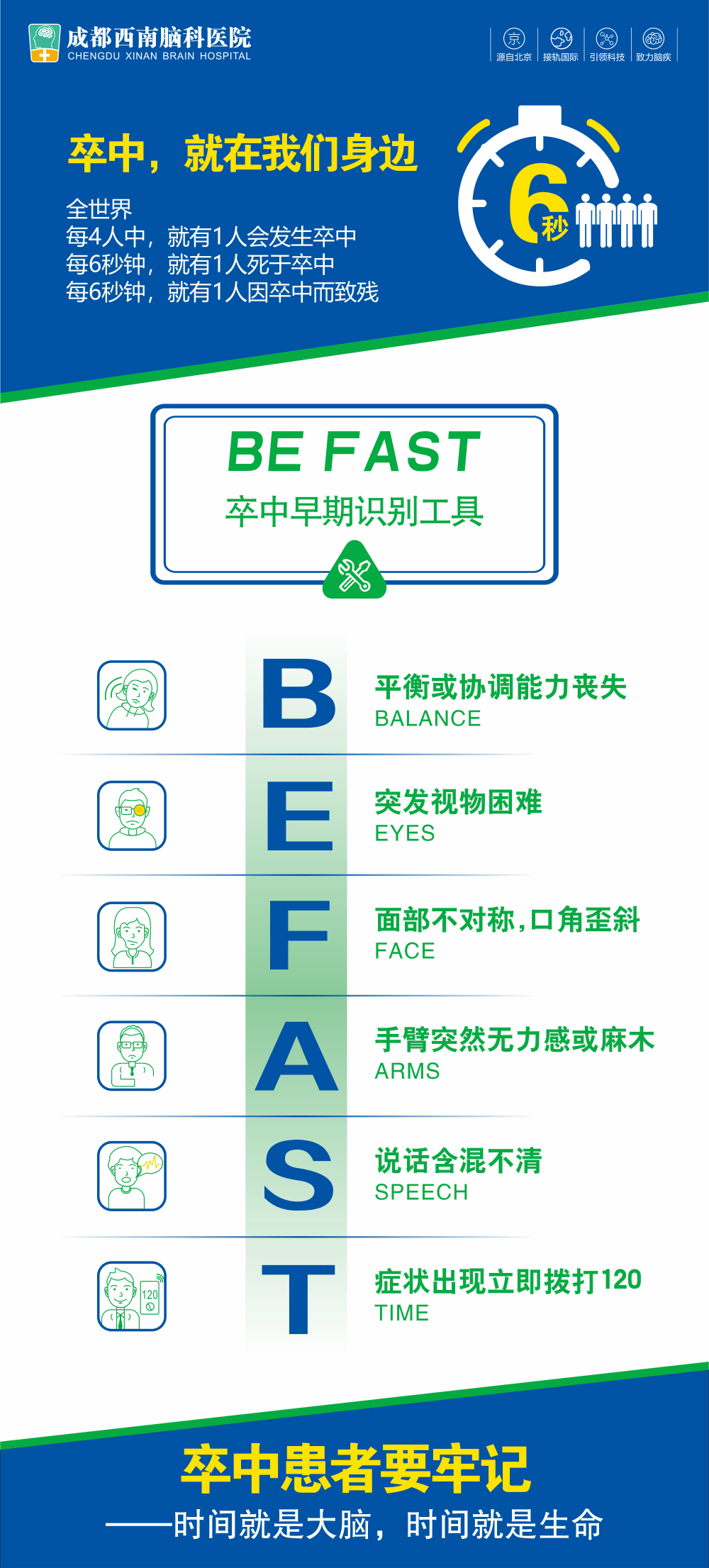 想要抢时间,家属要牢记“BE FAST”口诀进行判断,也可以记一个 更简单的:言语含糊嘴角歪,胳膊不抬奔医院。