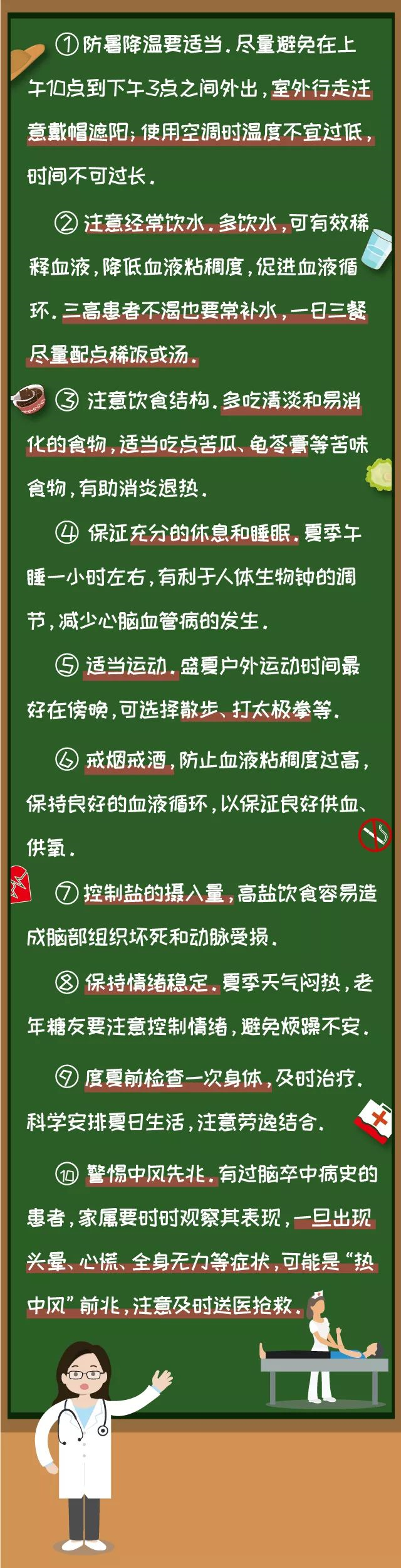另一方面,夏季气温高,易出现情绪烦躁、血压波动的状况。加上空调房内外温差较大,冷热之间容易导致脑部血液循环障碍。这些都是诱发“热中风”的因素。