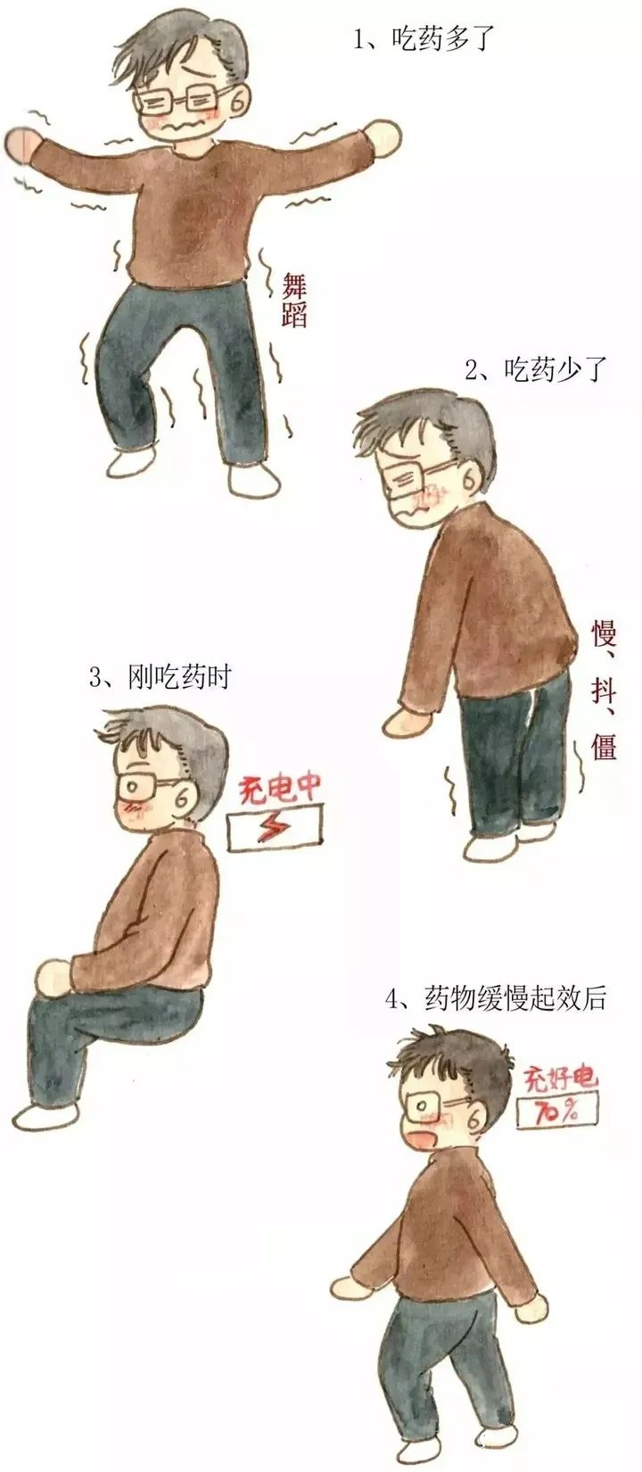 其次,要科学规范地用药,临床上有些患者却忽视这点,不去医院由专业医生对其病情进行判断调药,擅自调整剂量和换药,今天听别人说这种药有效就去试,那种药好就去加。服药时间不规律,不管用药间隔时间、用药剂量,只要自己状态好就行。这也是导致异动症出现的比较常见的原因。
