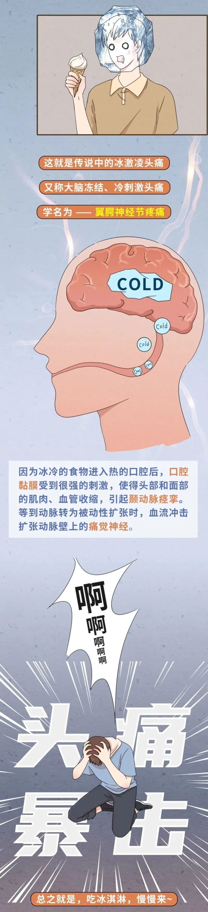 当人体摄入冰冷食品时,大脑以为“天冷了”,会想办法把颅内温度上升到正常范围。此时血管扩张,想要通过血液循环为大脑带去更多热量,但正常的组织此时也受到了挤压,相应的痛觉感受器被激活,头痛就产生了。