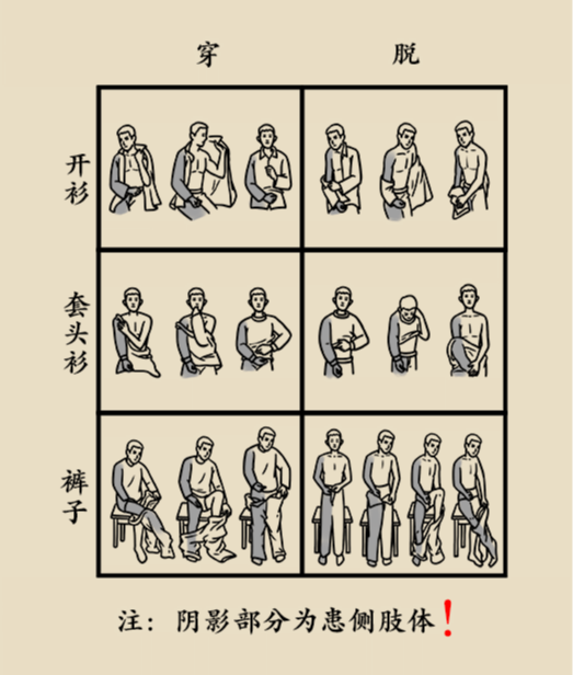 脱衣时,先脱健侧,再脱患侧。