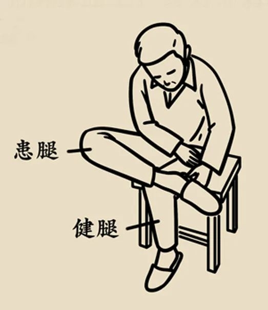 把患侧鞋子放健侧旁边,用健侧手拉裤腿,把患侧踝关节搭在健侧膝盖上,穿好患侧鞋后放下。