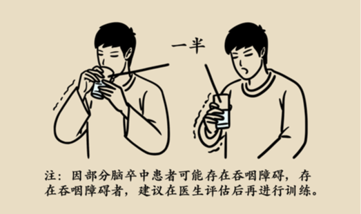 先训练双手喝水,用健侧手辅助患侧手一起完成喝水动作。